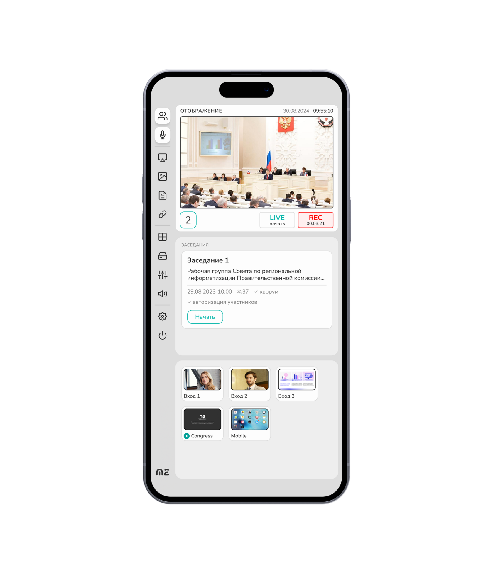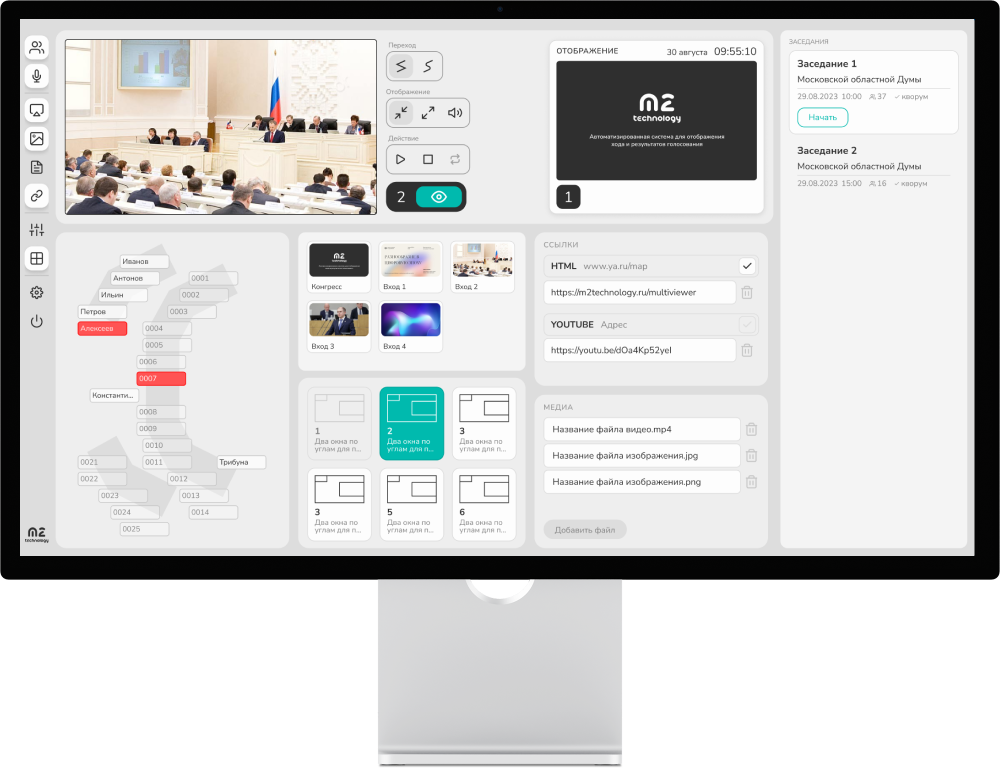 При использовании m2 Congress на базе платформы m2 Multiviewer, нажатие на микрофон сопровождается автоматическим наведением камеры, отображением и подписью выступающего на экранной форме. Включение второго микрофона сопровождается тем же действием, при этом на экранной форме отображаются оба выступающих.