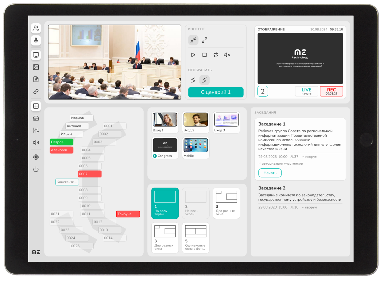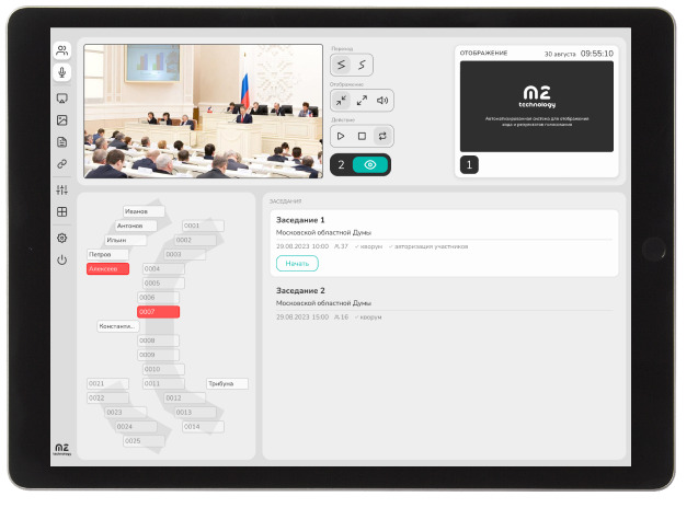 Представляет собой схему зала с рассадкой участников, согласно регламенту заседания. Оператор может управлять микрофонами участников заседания, а цветовая индикация позволяет контролировать ход обсуждения.