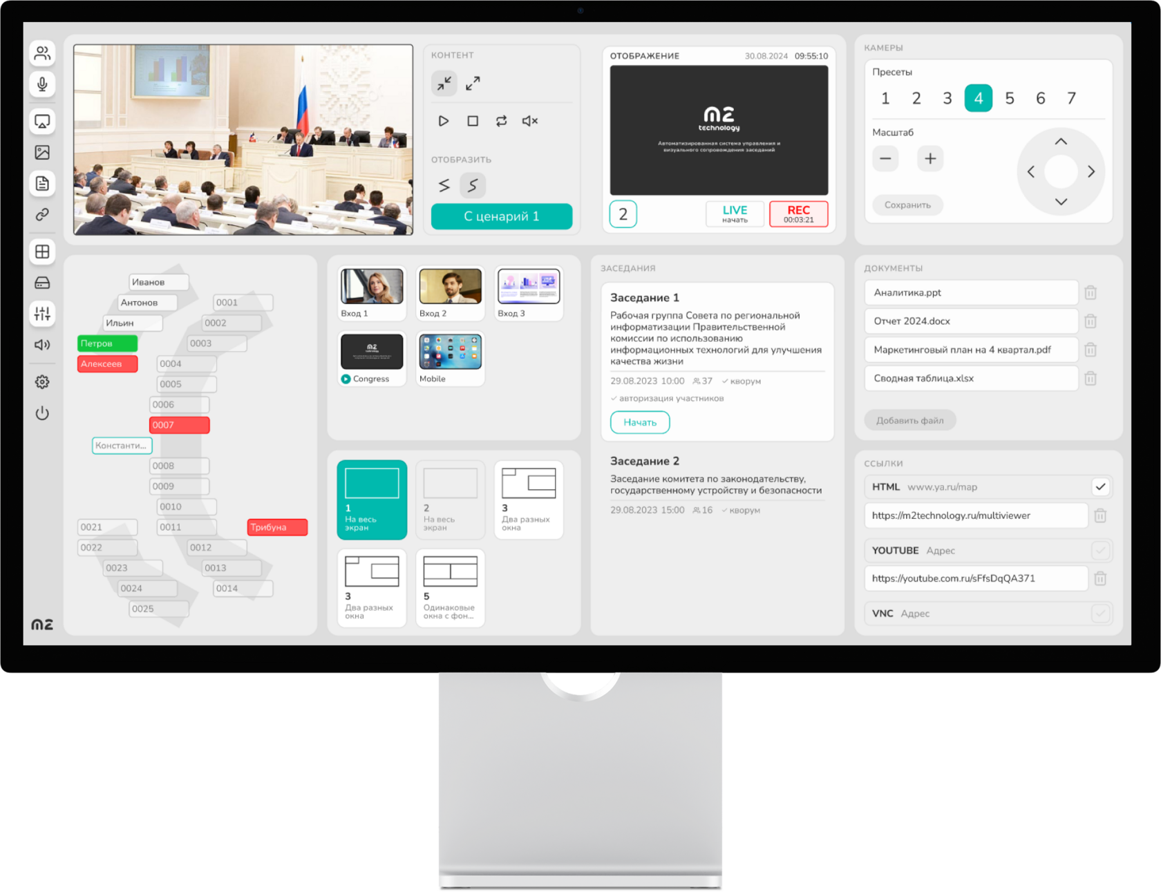 Интуитивный веб-интерфейс, формирование повестки с прикрепленными документами, управление микрофонами и визуализация результатов голосований.