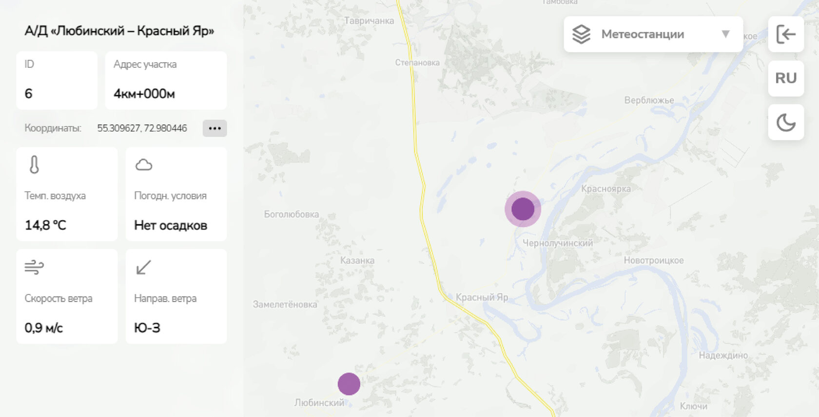 Интерактивный слой картографических данных, отображающий точки расположений устройств метеорологических измерений
