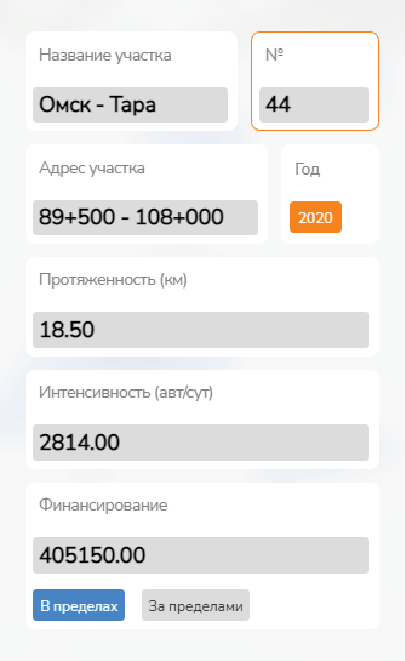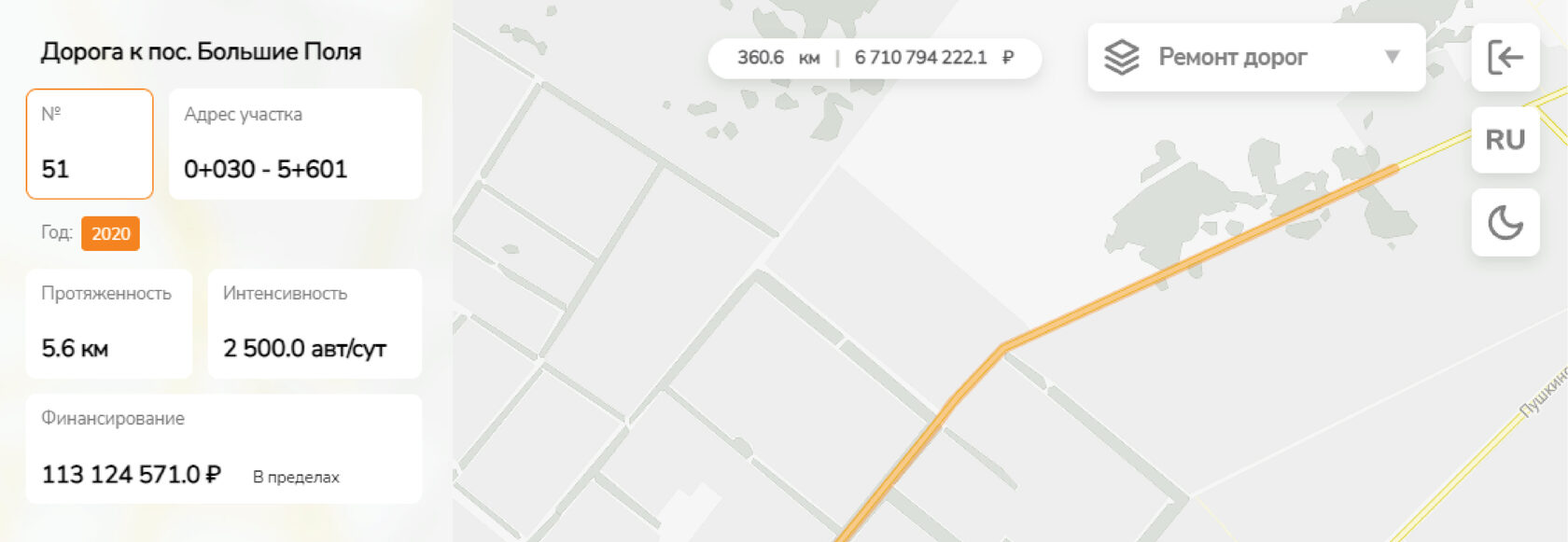 Интерактивный слой, на котором отображен участки дорог c порядковыми номерами и цветовым делением